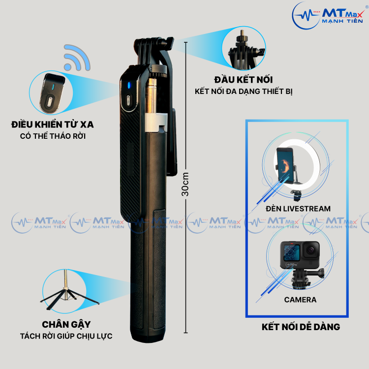 Máy điều khiển từ xa được gắn trực tiếp lên thân gậy vô cùng gọn gàng, tránh rơi rớt và mất. Sử dụng hệ thống bluetooth kết nối cực kì dễ dàng với các thiết bị điện thoại, máy chụp ảnh không cần dây nhợ rườm rà, chụp ảnh võn vẹn chỉ bằng 1 chạm. Sạc pin trực tiếp trên thân máy thông qua cổng sạc Type-C