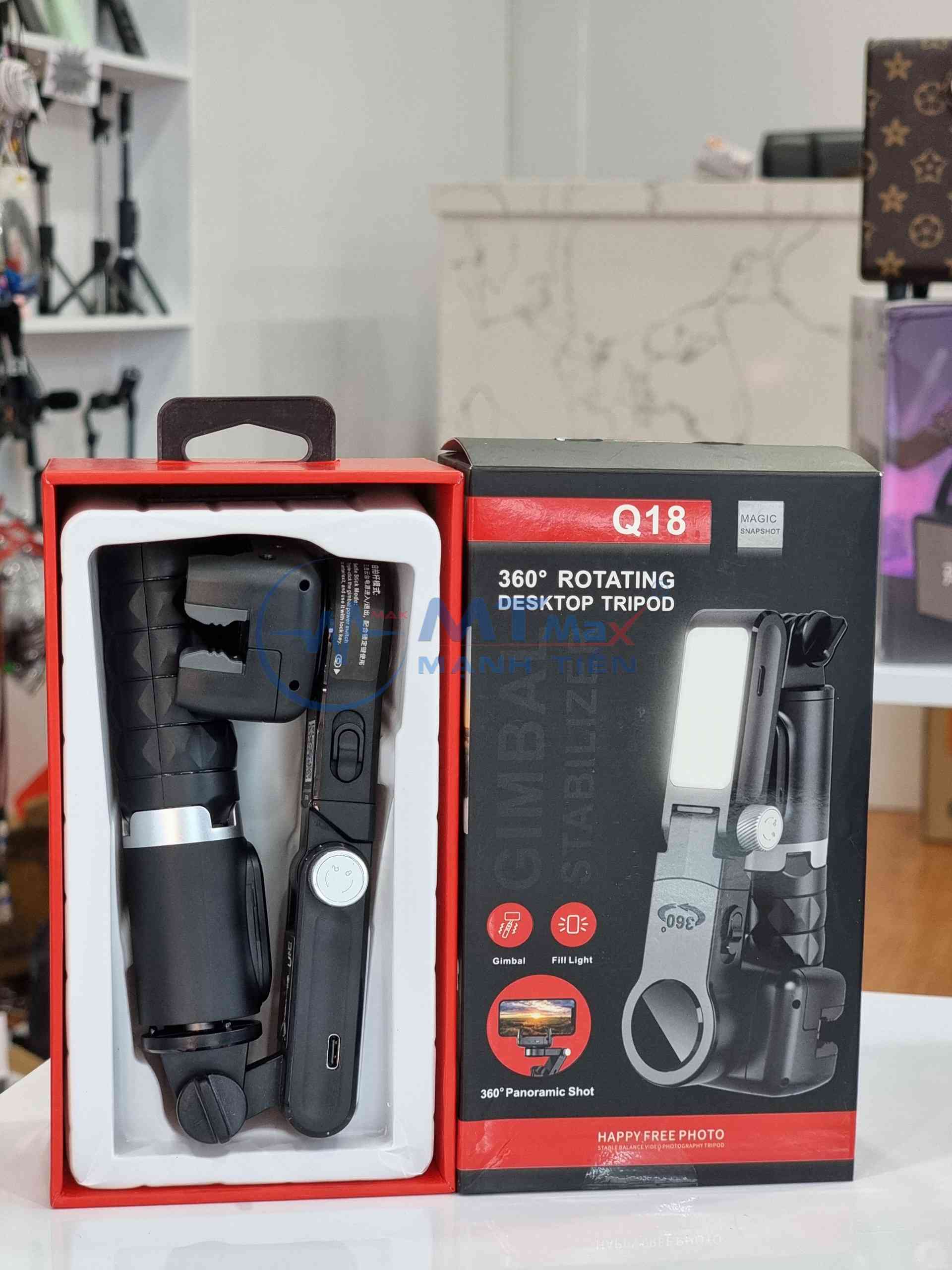 - Gimbal Q18 - Thiết bị ổn định camera, tích hợp đèn làm đẹp và điều khiển từ xa