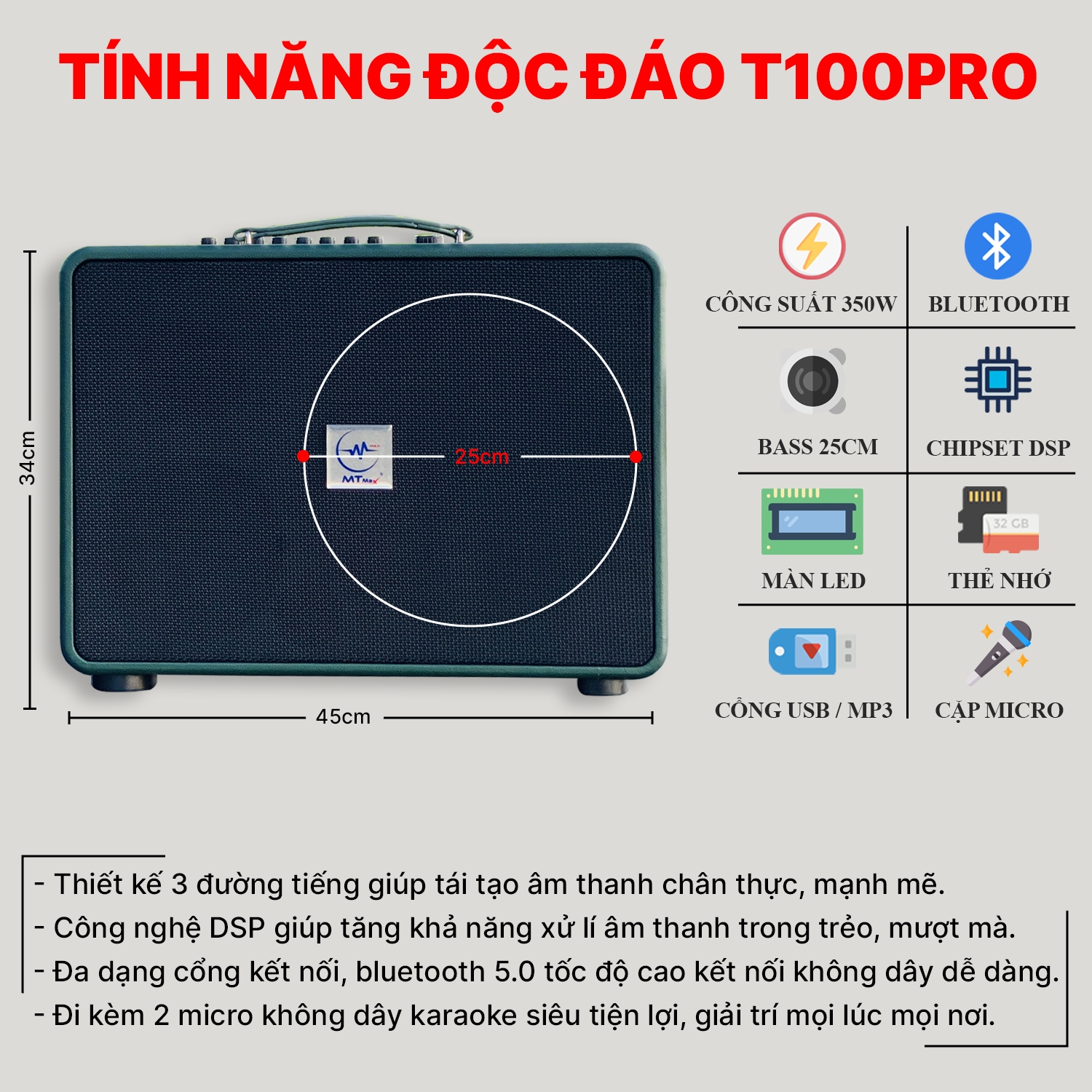 Loa Xách Tay Chính Hãng MTMAX T100PRO - Loa Karaoke Di Động 3 Đường Giá Rẻ Công Suất Lớn 350W Bass Siêu Trầm 25cm Điều Chỉnh Bass Treble Echo Reverb Dễ Dàng Bảo Hành 12 Tháng Tặng Kèm 2 Micro Cao Cấp
