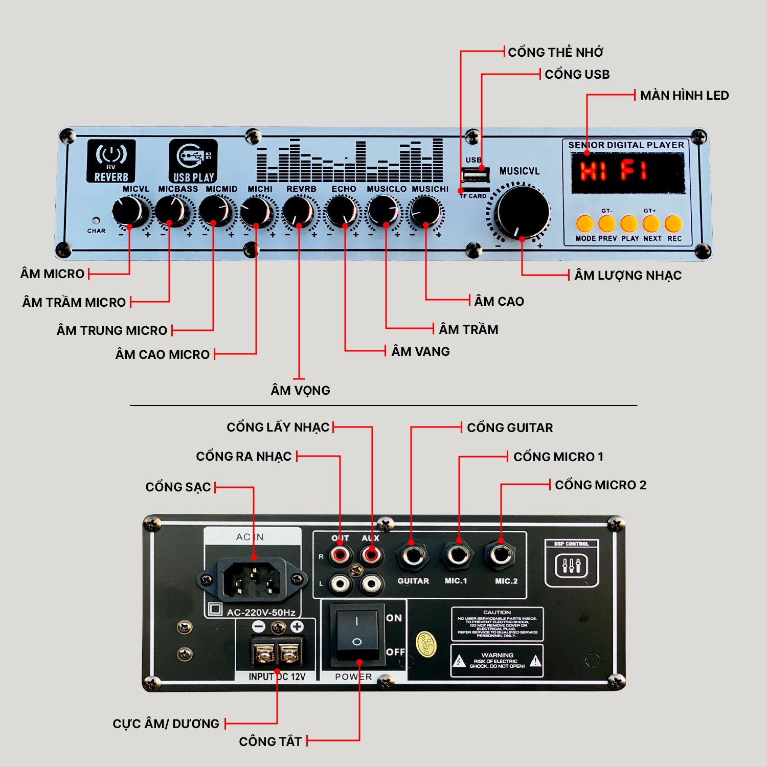 - Kết nối: BT, USB, TF, Hoa sen, cổng mic, guitar